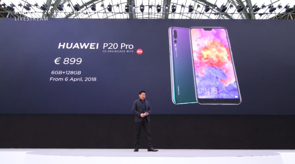 华为 P20 Pro 定价 899 欧元(约 6999 元人民币),6GB 内存、128GB 存储,将在 4 月 6 日出售。